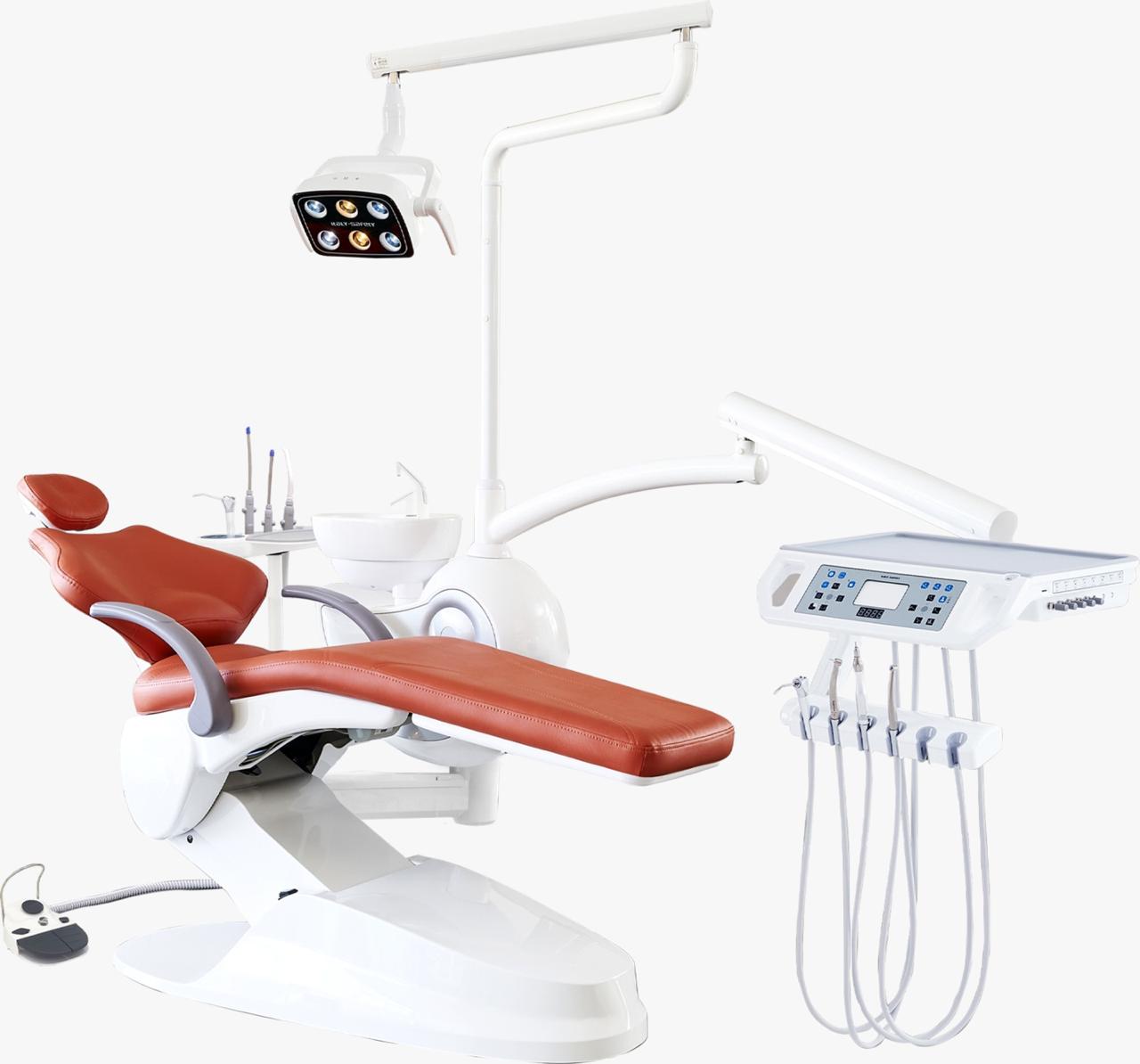 • Water and air tubes made in German • Triple filter system • imported leather more comfortable • Safety stop • Led Operation lamp • New control system • Gargling position • Anti-retraction valve • Water tank 6L • 3-way syringe *2pcs · Round foot pedal (with self –lock function ) · Adjustable head rest • Turn able side box & assistant control holder · Ultra wide bracket table · Metal backrest
